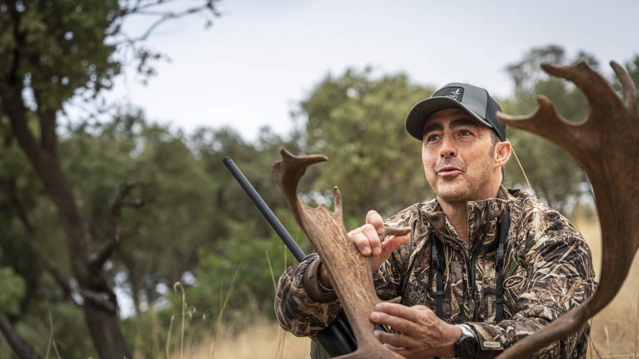 La aproximación resulta eficaz. Ya dentro de un tiro ético, alrededor de los ciento cincuenta metros, aparece el gamo adulto que buscaban, un ejemplar entrado en años cuya extracción forma parte del equilibrio de la finca. El lance se resuelve con un disparo limpio y el grupo se acerca para cobrar la pieza. No hay celebraciones, solo reconocimiento hacia un animal que ya había cumplido su ciclo en la población.