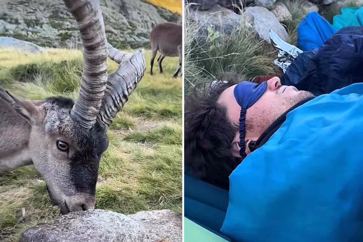Un senderista duerme al raso sin saber que un macho montés está pastando a sólo un metro de su cara